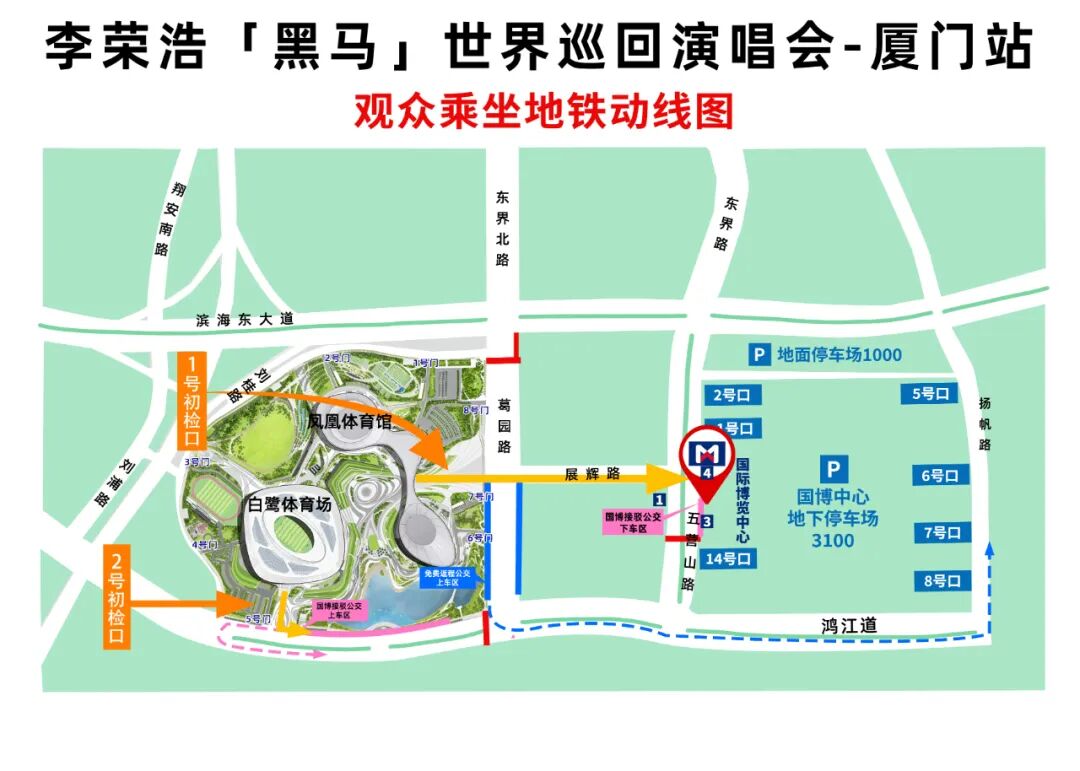 · 散场进岛公交接驳 散场时,需乘坐公交进岛的观众,可从南广场1号检票口步行至葛园路口南段,或从北广场2号检票口步行至鸿江道西门,统一搭乘接驳公交前往岛内万达广场(国贸中心站)、SM生活广场等地点。