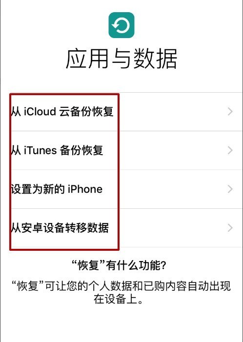 “从iCloud云备份恢复”,需要你拥有Apple ID,对于初入苹果的新用户而言由于你之前没有备份,所以这一项可以无视。