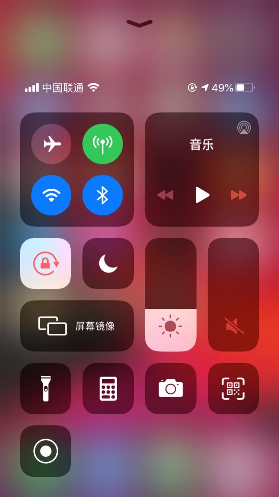 你可以将它看作是整个手机系统的“微控台”,控制中心的顶端是一个简化版的状态栏,上面显示着运营商信息、网络信号以及电量。控制中心的第一部分,表面看上去是由“飞行模式、数据流量、Wi-Fi、蓝牙”四个快捷按钮所组成的区域,但是当你“长按”其中的某个按钮之后,这块小区域就会突出并变大,这时你会发现,原来这个区域其实一共有6个按钮,除了飞行模式、数据流量、Wi-Fi、蓝牙”外,还有“隔空投送”和“个人热点”这两个新按钮。