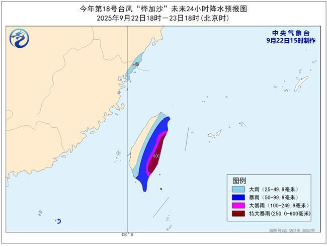 降水预报:22日18时至23日18时,福建东北部、浙江东南部局地、台湾岛中东部有大到暴雨,台湾岛东部有大暴雨,局地特大暴雨(250-600毫米)。