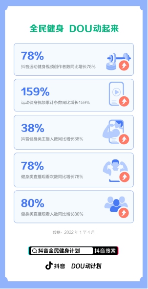 2022年开年,以短视频、直播为载体的运动健身内容持续走热。公开数据显示,1至4月,抖音平台运动健身视频创作者数同比增长78%,运动健身视频累计条数同比增长159%;健身类主播人数同比增长38%,健身类直播观看次数同比增长78%,健身类直播观看人数同比增长80%。随着带练创作者和跟练用户同时增长,大众的运动健身热情正在进一步提升。