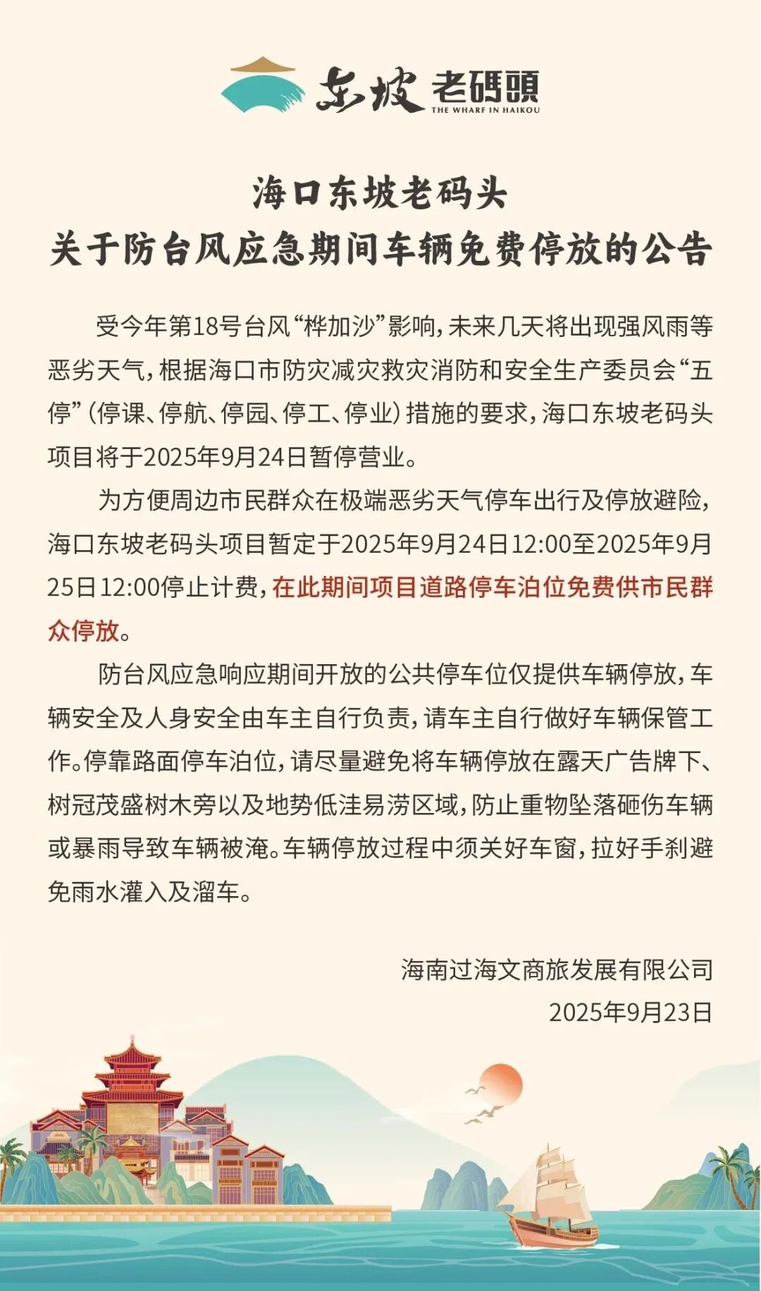海口东坡老码头公告显示,该项目于9月24日暂停营业。为方便周边市民群众在极端恶劣天气停车出行及停放避险,9月24日12:00—9月25日12:00,海口东坡老码头项目道路停车泊位免费供市民群众停放。