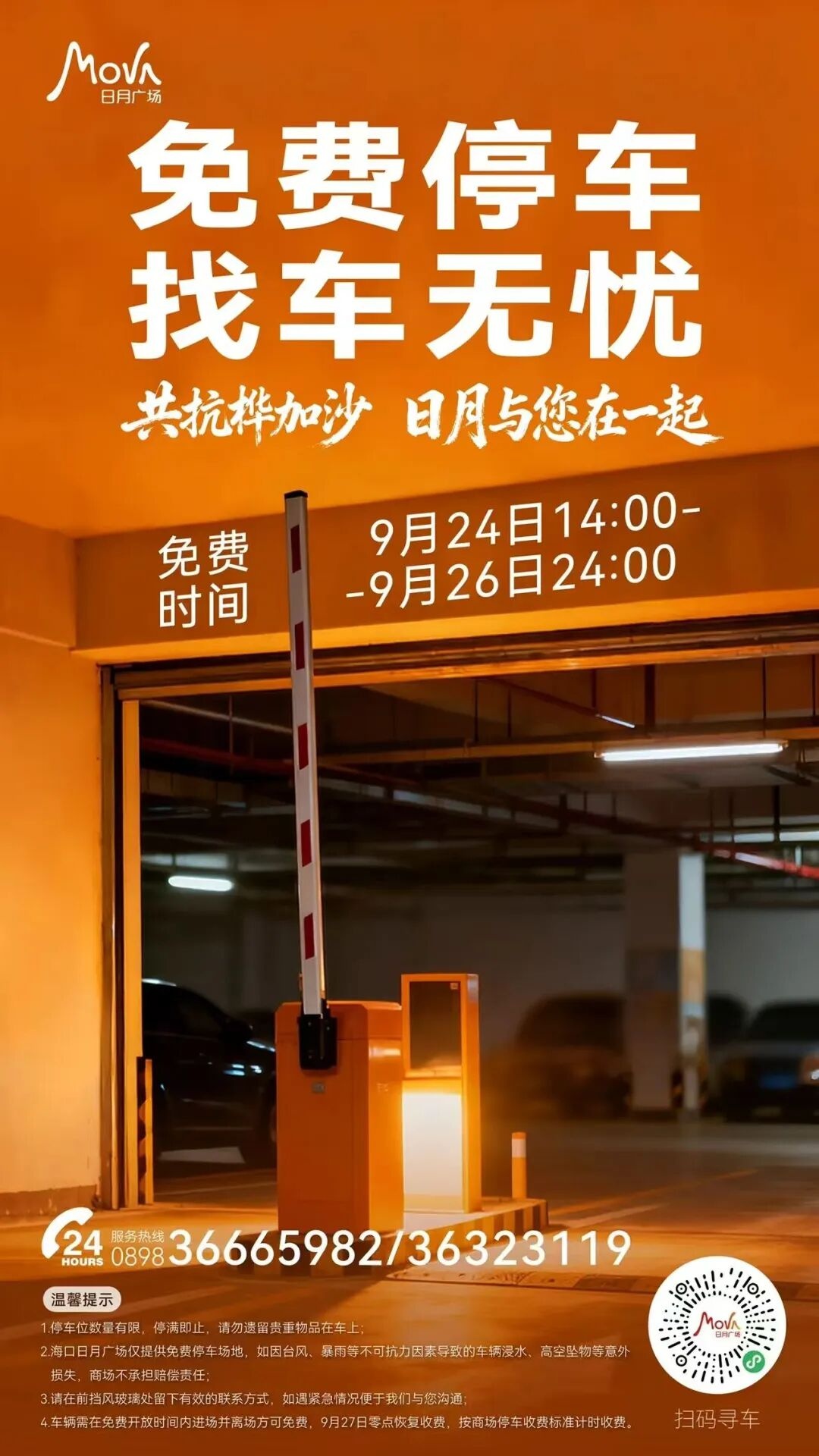 海口日月广场在9月24日14:00—9月26日24:00提供免费停车服务。