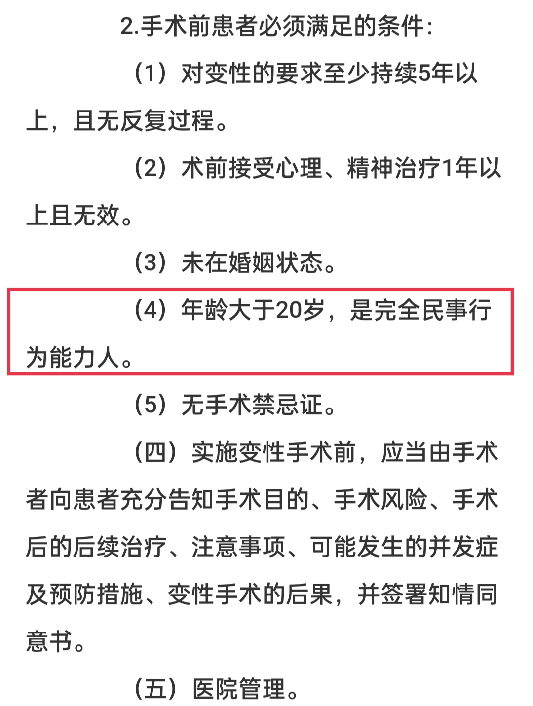 但是国家卫生部明文规定,变性手术前患者必须满足的条件包括:年龄大于20岁。