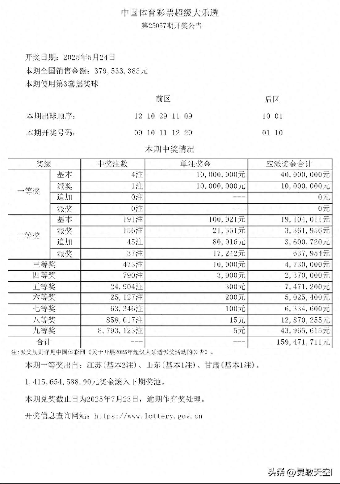大乐透第25057期开奖号码揭晓,前区号码为9、10、11、12、29后区号码为1、10。令人瞩目的是,本期一等奖全国仅中出4注,单注奖金高达1000万元。这4注一等奖分别花落三个地区,其中江苏斩获基本一等奖2注,山东也收获基本一等奖1注,甘肃同样中得基本一等奖1注,四川也有幸获得基本一等奖1注。此外,二等奖全国共开出191注,单注奖金为10万元。