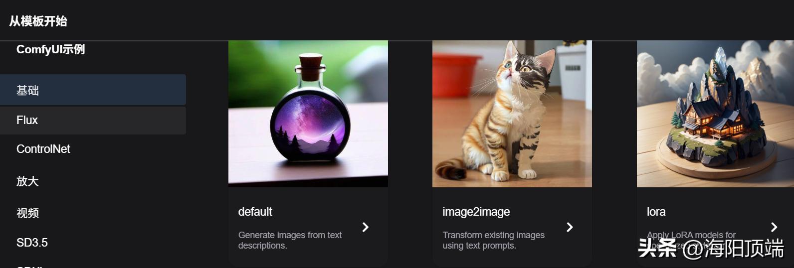 一会就弹出浏览器界面了,自动打开了http://127.0.0.1:8188/。点工作流,浏览模板。选一个你想使用的模板。