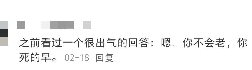 下面这位网友的回答很直接,直抒胸臆,措辞犀利,说的特别好。没有被别人尊重的时候,有时也没有必要委屈求全,不用给对方留脸面。就直接了当的回,你不会被人说老,ni会英年早逝,永远年轻,这句话真挺狠的哈!