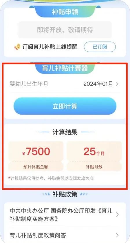 从2025年1月1日起,对符合法律法规规定生育的3周岁以下婴幼儿发放补贴,至其年满3周岁,补贴金额将按月数折算后发放,用户现可通过“育儿补贴计算器”功能进行查询,根据出生年月选择,计算出可领取的补贴金额。