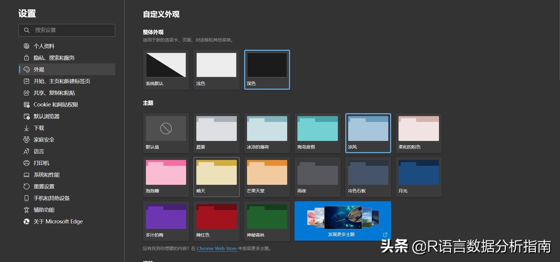 由于Edge支持更多的个性化设置也使得它相对于Chrome更加容易的上手,可以看到支持如下多种外观布局与主题,同时还支持书签的快速导入方便切换浏览器