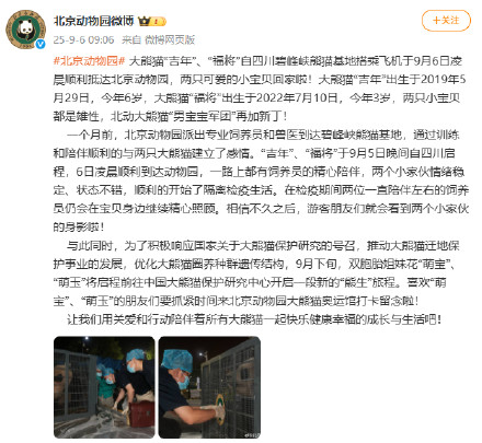大熊猫“吉年”、“福将”自四川碧峰峡熊猫基地搭乘飞机于9月6日凌晨顺利抵达北京动物园。9月下旬,双胞胎姐妹花“萌宝”、“萌玉”将启程前往中国大熊猫保护研究中心开启一段新的“熊生”旅程。喜欢“萌宝”、“萌玉”的朋友们要抓紧时间来北京动物园大熊猫奥运馆打卡留念啦!(北京动物园)