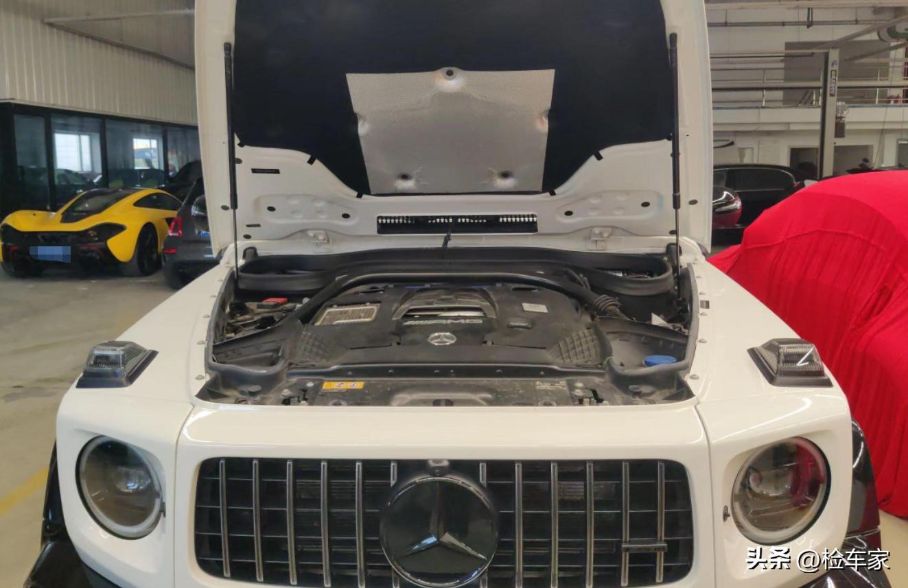 打开机盖后看到左右大灯没有拆卸,生产日期也符合车辆总装出厂的日期;机盖的锁块和前格栅也没有拆卸更换的情况;说明前面没有发生碰撞和改装,毕竟奔驰新老款的G63,外观尺寸基本没啥变化套件是通用的。你懂我意思吧?老款的随便改一下就成新款了,别人是很难看出来的,尤其是不懂车的小姐姐。
