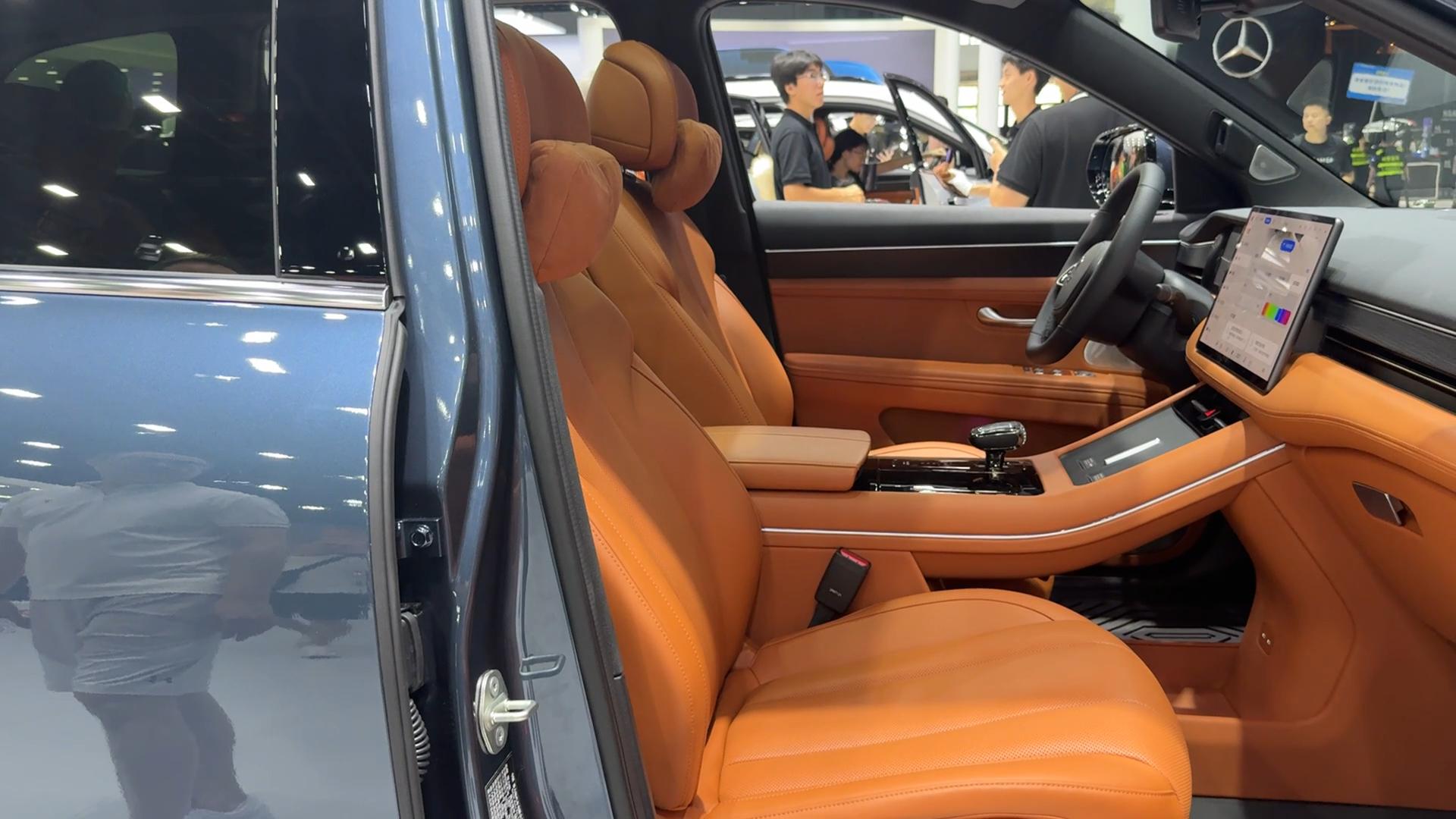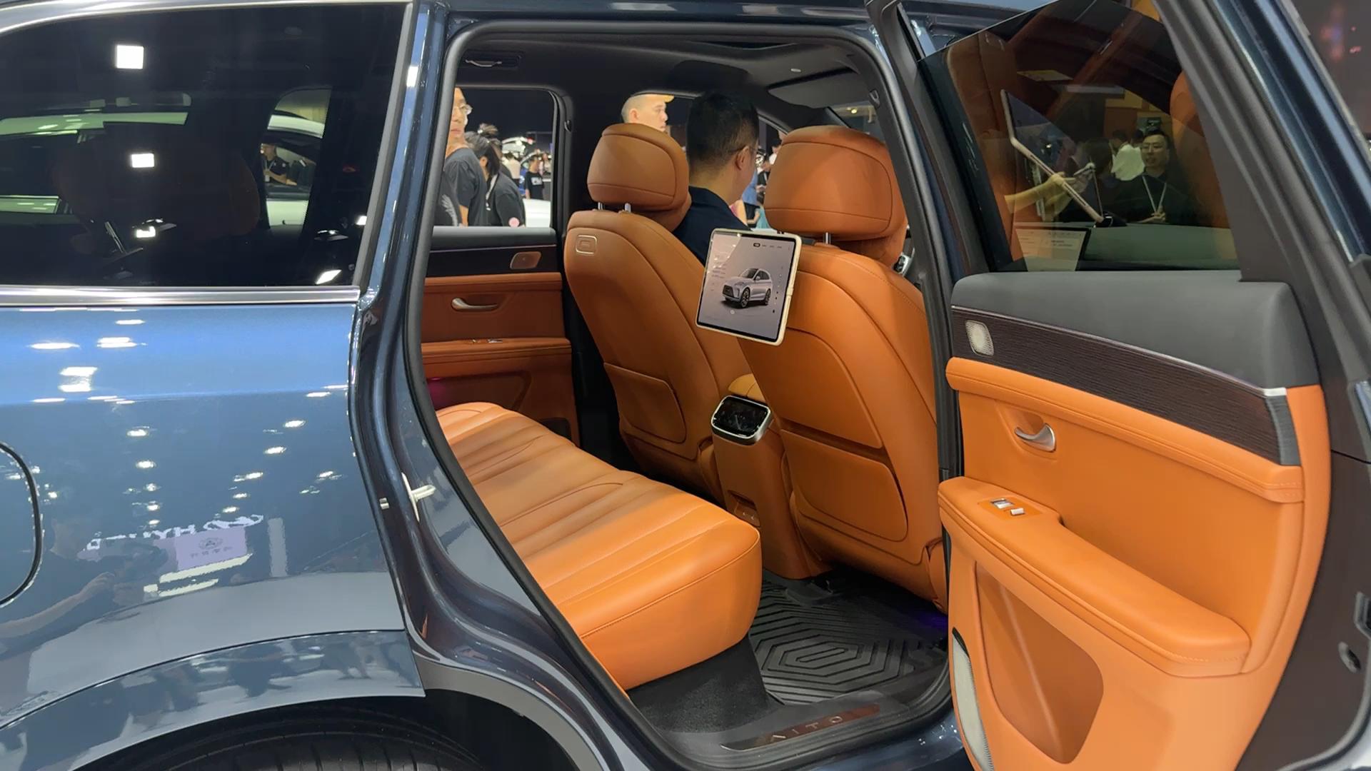 内部方向盘采用真皮包裹,但是座椅采用真皮和仿皮混搭材质。其实这种设计,对于通气性以及柔软和舒适程度,做的非常棒。里面的空间特别大,车身宽度就接近两米了,长度是达到五米以上的。它和理想L8属于同一级别,但是这款车现在一个月能卖出1.5万台至2万台,销量成绩是比较火爆。