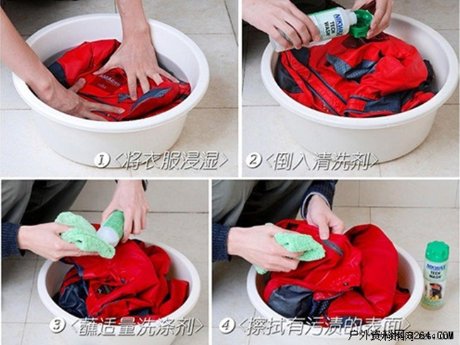 先将服装完全浸湿后倒入100毫升清洗剂(适合两件衣服)浸泡10分钟左右,然后用海绵或棉布进行擦洗,对于局部顽渍可以用海绵或棉布直接蘸适量洗涤液擦拭。Tech Wash属于中性洗涤剂,洗涤过程中不必担心伤及皮肤,清洗之后漂洗至水清即可。