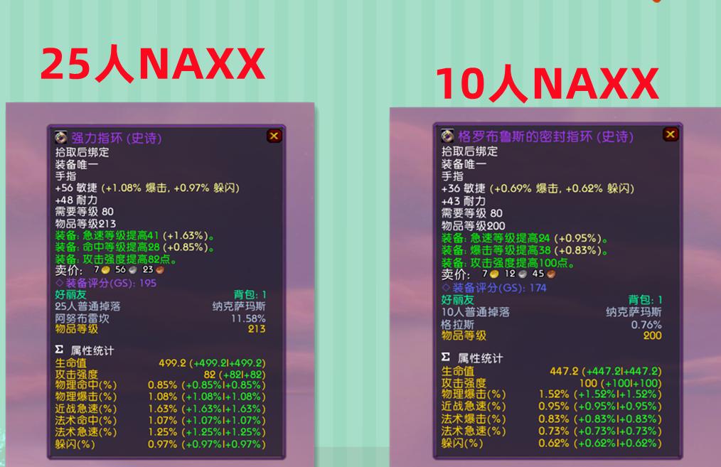 咱们再来比较一个肯瑞托戒指的属性,上图是肯瑞托指环的属性(购买的价格是8500金),物品等级是200。跟肯瑞托戒指作比较的是10人NAXX掉落的格罗布鲁斯的密封指环和25人NAXX掉落的强力指环(下图),大家可以自己对比一下属性,可以看出肯瑞托戒指的属性和10人NAXX掉落的戒指是一个级别的,不如25人NAXX掉落的戒指。