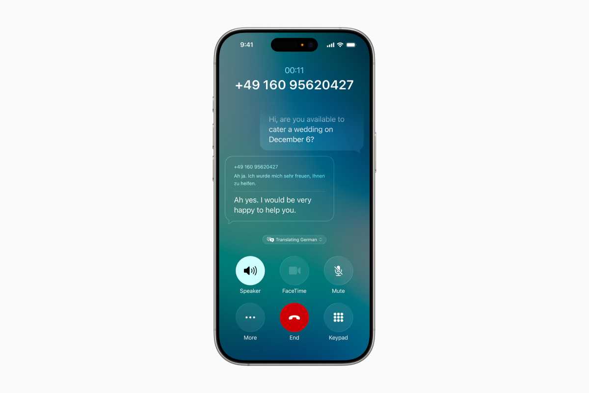 如果你通过电话应用与某人通话,iPhone会对所说内容进行翻译,通过语音将对方的话翻译成你的语言。接收方也会听到用他们自己的语言翻译后的内容。显然,他们不需要拥有iPhone。目前主要的限制是,电话实时翻译功能仅适用于英语、法语、德语、葡萄牙语和西班牙语的一对一通话。