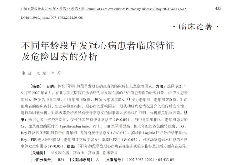 [1]曲政.不同年龄段早发冠心病患者临床特征及危险因素的分析, 心 肺血管病杂志, 2024-05-26