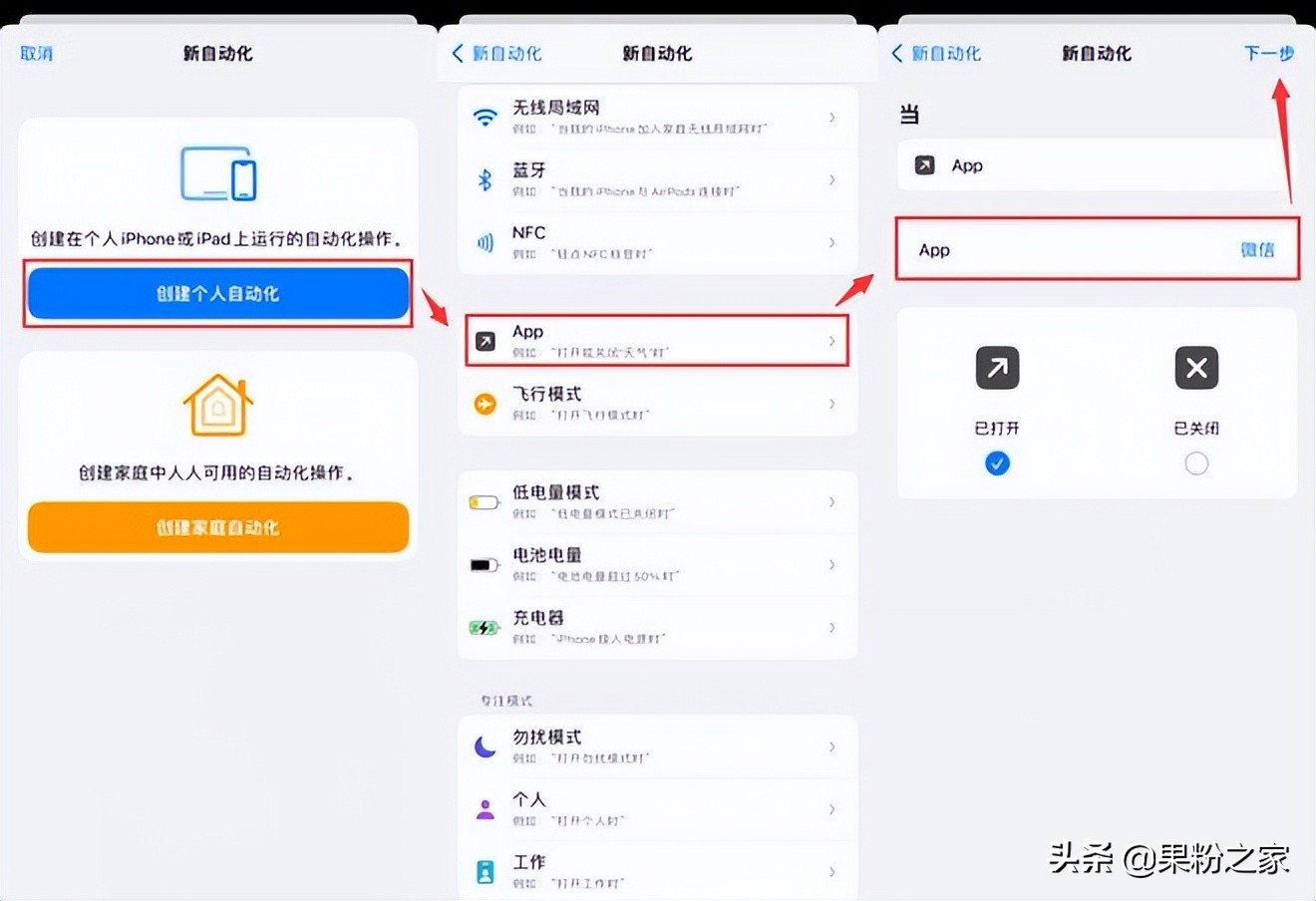 需要注意的是,由于电池电量是实时刷新的,因此我们还需要通过设置打开一个常用App来刷新电量信息。以微信为例,我们先创建个人自动化--APP--选择常用的微信--下一步。