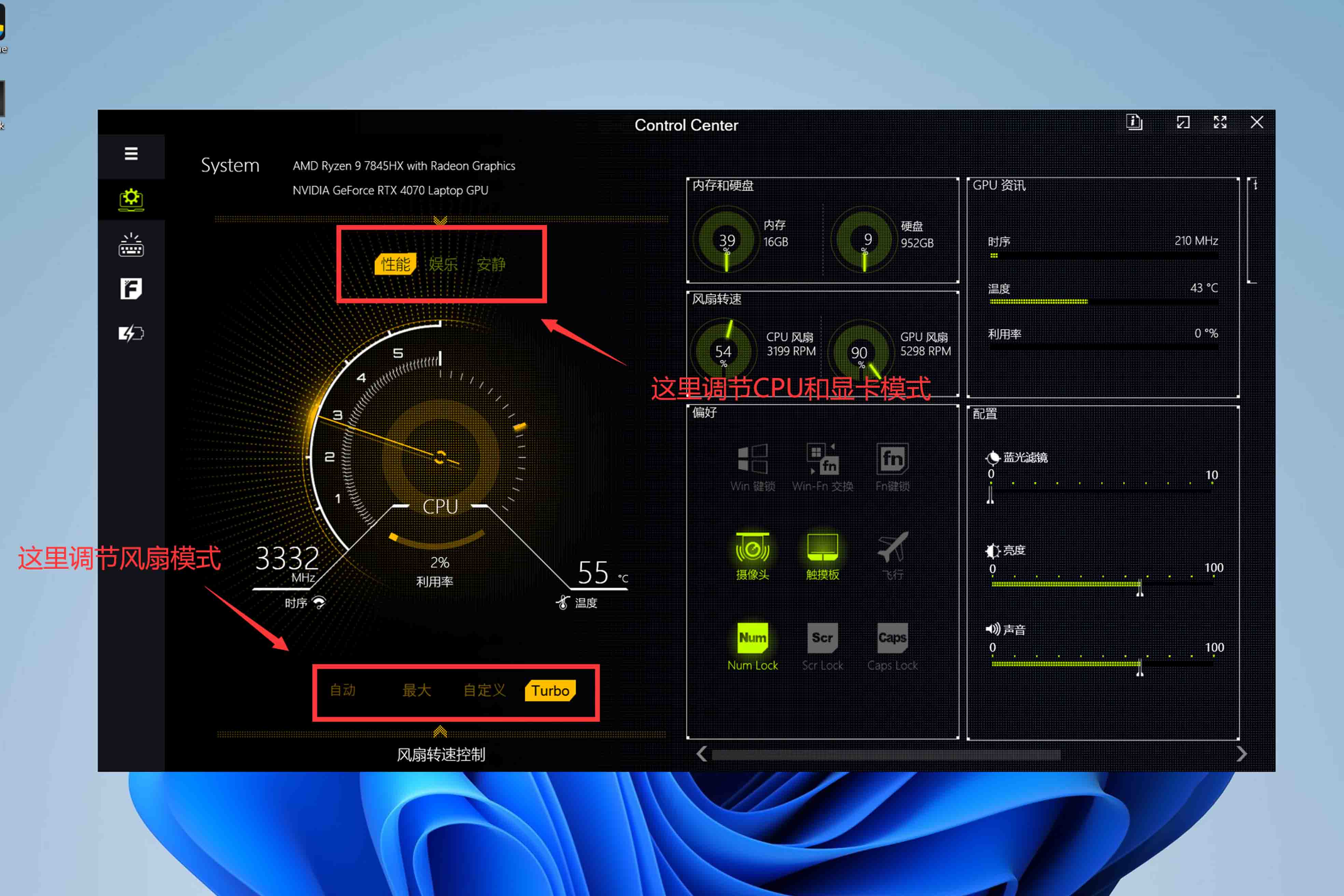 ● 一键切换风扇模式,常规使用不建议改最大或者Turbo,确实风躁很大。