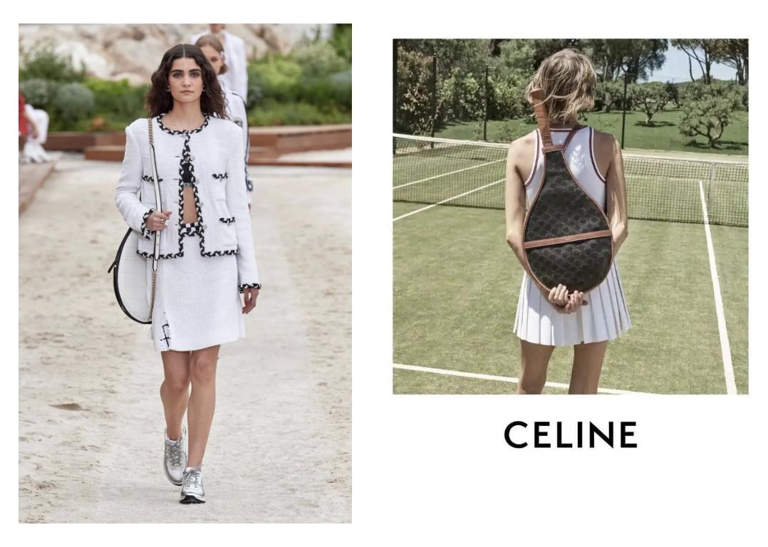 「山系户外风」吹了两三年还没散,「藤校学院风」就爱卫衣polo衫,夏天一场温网又把网球服推上潮流高点,香奈儿把网球裙元素融入标志性的软呢半裙,Celine直接推出网球主题胶囊系列,网球裙、polo衫、球拍袋一应俱全。