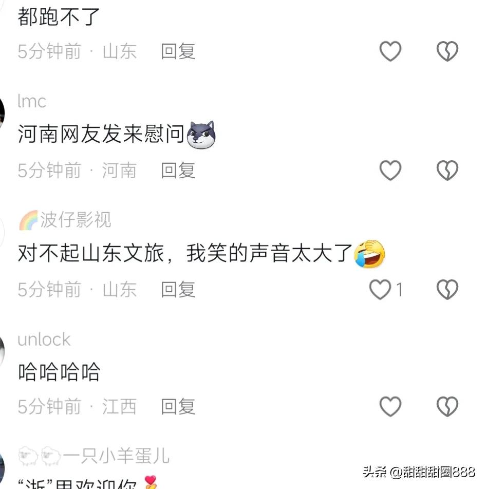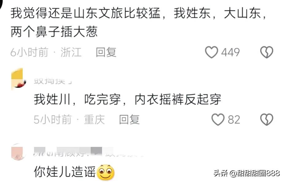这不四川的自己唱上了,我姓川,吃完穿,内衣摇裤反着穿你唱的还挺丝滑,有可能过会四川文旅就唱上了。你在看山东,想笑死谁吗还两根鼻子插大葱,这都调侃自己省了吗哈哈,但这几天浙江一直没动静。