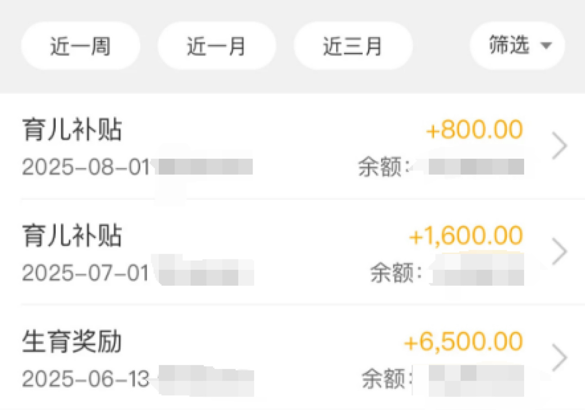 2025年5月,婷婷顺利生产,孩子也成功落户到天门,生育二孩的奖励和补贴也比她想象中来得更快。她向记者展示了自己的账户截图,在提交资料审核一个月左右,6500元的生育奖励就到账了。7月1日,两个月共1600元的生育补贴到账,8月1日,补贴依旧准时。