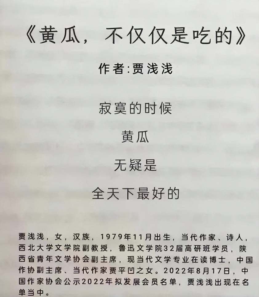 文学创作提倡严谨谦逊。无论是博士还是博士后,都有创作标准,都有情感共鸣。不能随心所欲,想当然即然。贾浅浅的另一篇《黄瓜,不仅仅是吃的》: