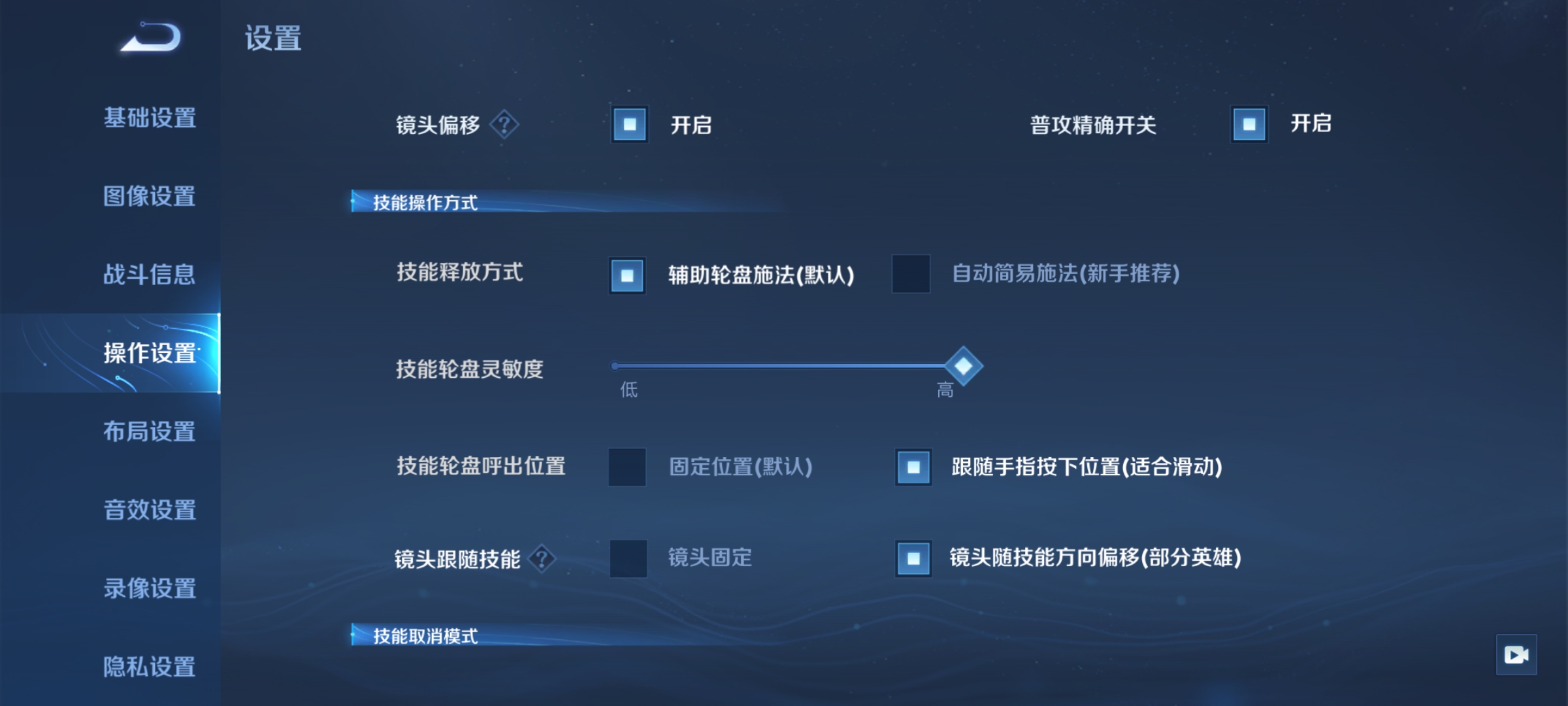 关于操作设置,一般来说都是使用自由攻击模式,推塔清兵补刀会很好用,少数英雄会选择使用模板锁定的模式,我个人觉得使用起来比较繁琐,不如补刀好用。