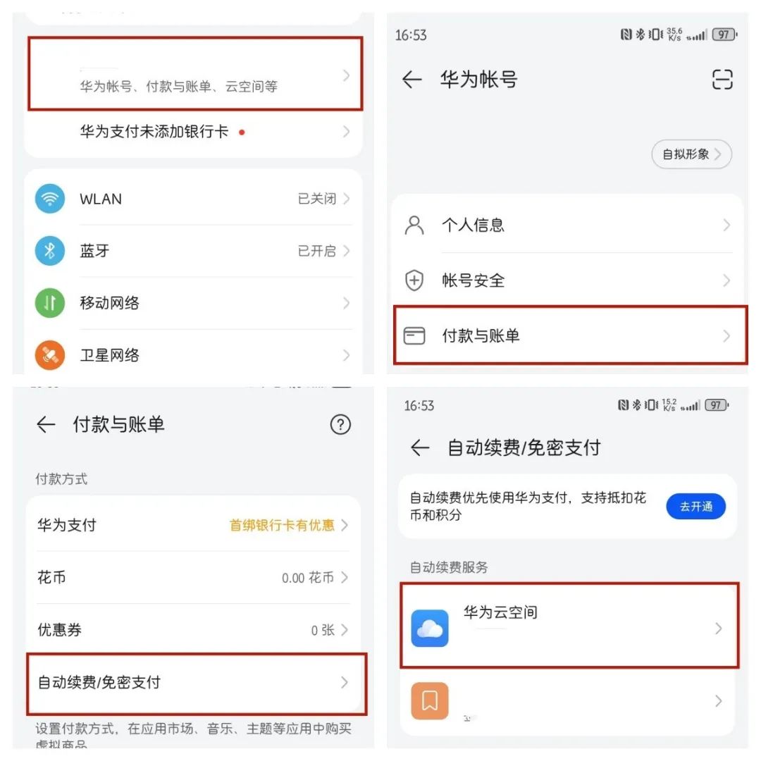 华为账号、付款与账单、云空间等