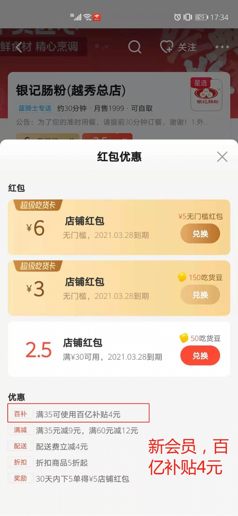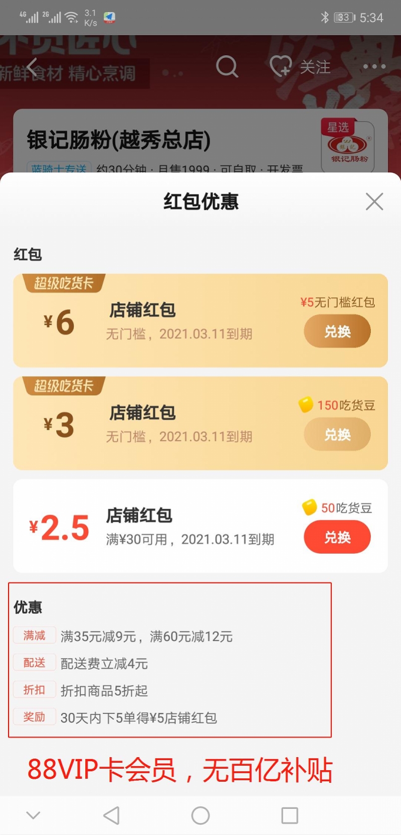 图:同一时间、同一家店,饿了么88VIP用户无百亿补贴,新会员有4元补贴