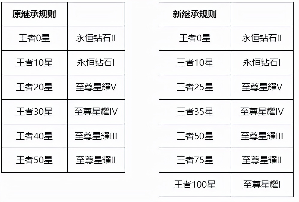 为了匹配新段位的等级体系,下赛季的段位继承表也改了。以往前赛季王者50星,下个赛季就会掉到星耀二,这个赛季得拿到75星,下个赛季才能掉到星耀二。
