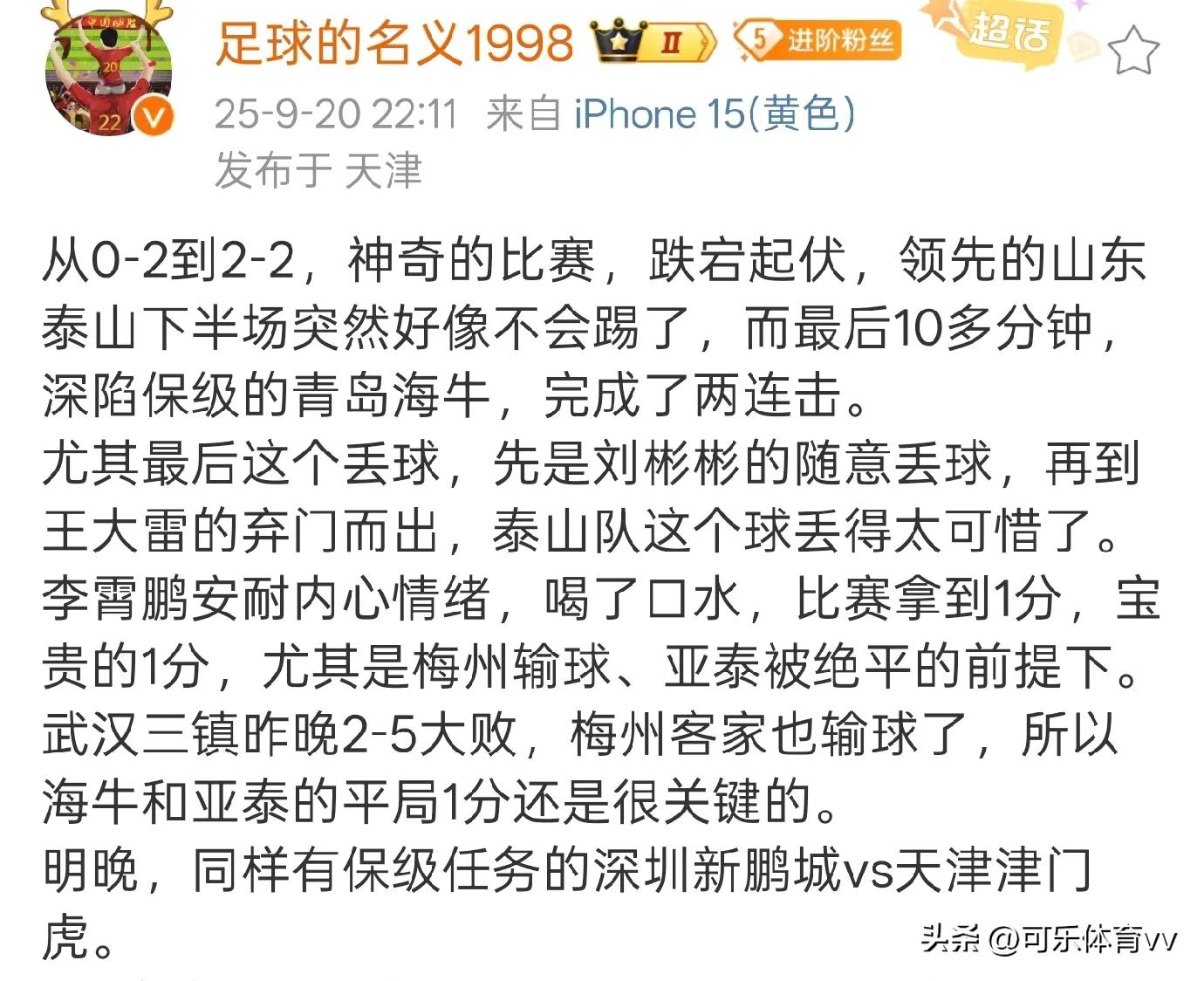 足球的名义1998:“从0-2到2-2,神奇的比赛,跌宕起伏,领先的山东泰山下半场突然好像不会踢了,而最后10多分钟,深陷保级的青岛海牛,完成了两连击。尤其最后这个丢球,先是刘彬彬的随意丢球,再到王大雷的弃门而出,泰山队这个球丢得太可惜了。李霄鹏按耐内心情绪,喝了口水,比赛拿到1分,宝贵的1分,尤其是梅州输球、亚泰被绝平的前提下。武汉三镇昨晚2-5大败,梅州客家也输球了,所以海牛和亚泰的平局1分还是很关键的。明晚,同样有保级任务的深圳新鹏城vs天津津门虎。”