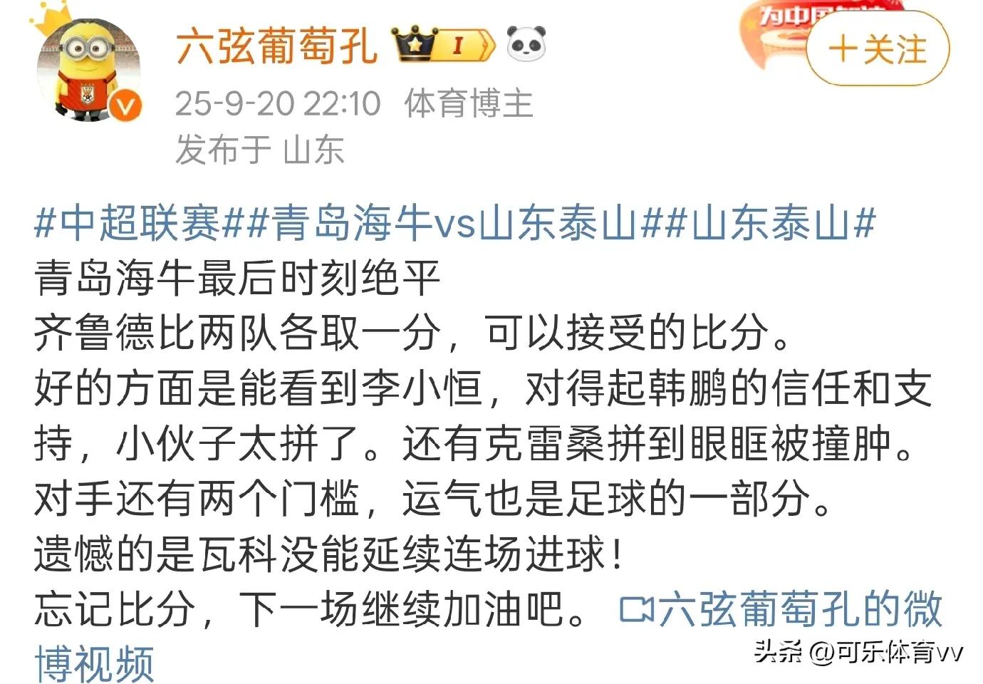 六弦葡萄孔:“青岛海牛最后时刻绝平齐鲁德比两队各取一分,可以接受的比分。好的方面是能看到李小恒,对得起韩鹏的信任和支持,小伙子太拼了。还有克雷桑拼到眼眶被撞肿。对手还有两个门槛,运气也是足球的一部分。遗憾的是瓦科没能延续连场进球!忘记比分,下一场继续加油吧。 ”