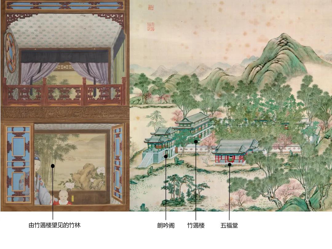 关于庆妃,也举一例。“皇子图”所绘室内二层格局和室外竹林、叠石牡丹共同营造的空间特征,与圆明园天然图画竹薖楼毫无二致,这是否暗示了永琰幼时曾被赐居圆明园五福堂[12](竹薖楼毗邻五福堂)的经历。作为养母,刚刚册封为妃的陆氏亦当同永琰生活于此[13]。画面上出现她(他)们共同的生活场景,当是紫衣主位勘为庆妃陆氏的一个旁证。