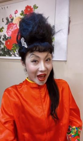 尤其是戴上假发、穿上一身大红色上衣时,更是马上变身为60岁老阿姨,连语气与妆容都模仿得十分一致,让人怀疑到底是不是换了个人。
