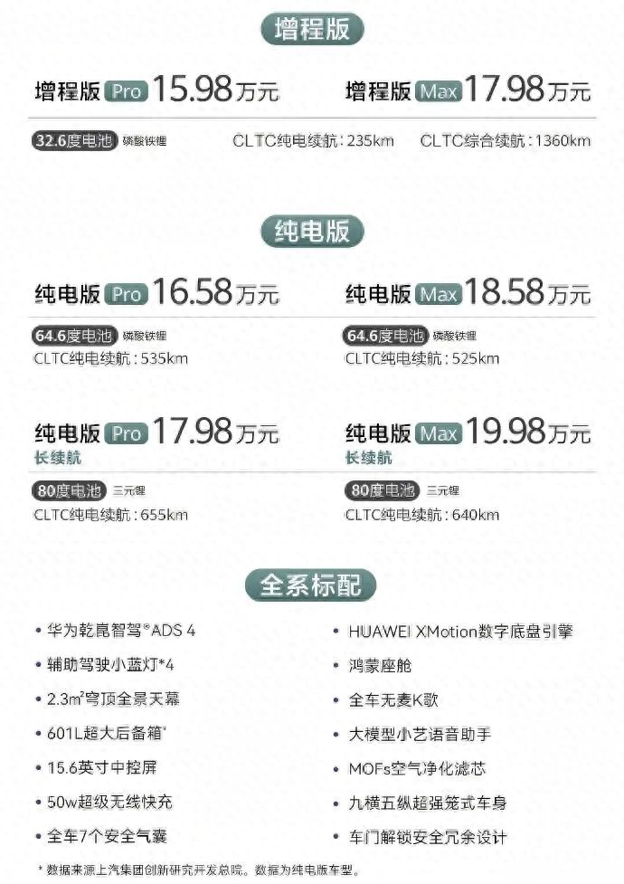 增程版只有两个配置:Pro和Max版本,而纯电版有四个版本:Pro、Pro长续航、Max、Max长续航。