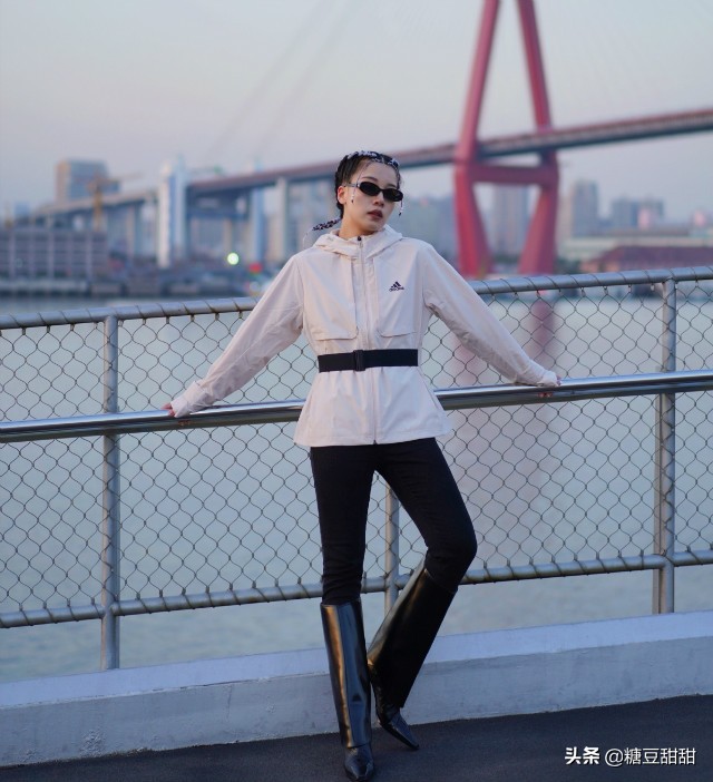 中长款的白色工装风外套非常冷酷帅气,搭配上炒鸡显瘦的黑色紧身裤,再来上一条和紧身裤同色的工装风帆布腰带,非常得中性帅气。
