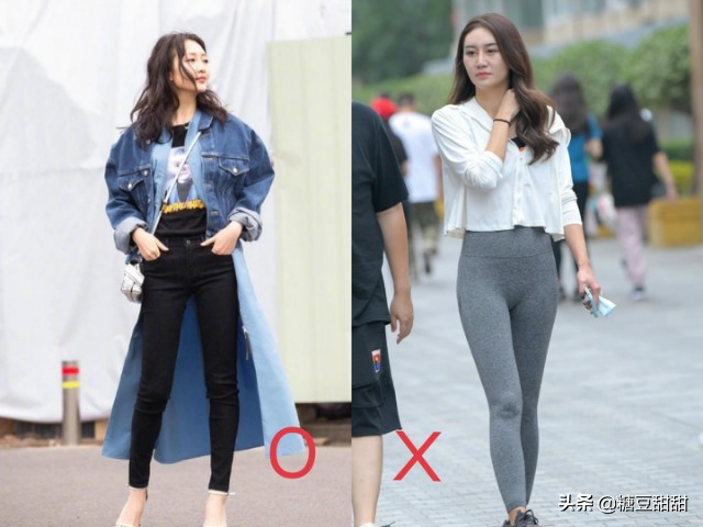 紧身裤在搭配时千万不要像右边的小姐姐一样,选择用在臀线上方的短款上装搭配紧身裤。露出臀线后不仅暴露缺点,完全贴合腿部的紧身裤露出三角区也是一个非常尴尬的事情。