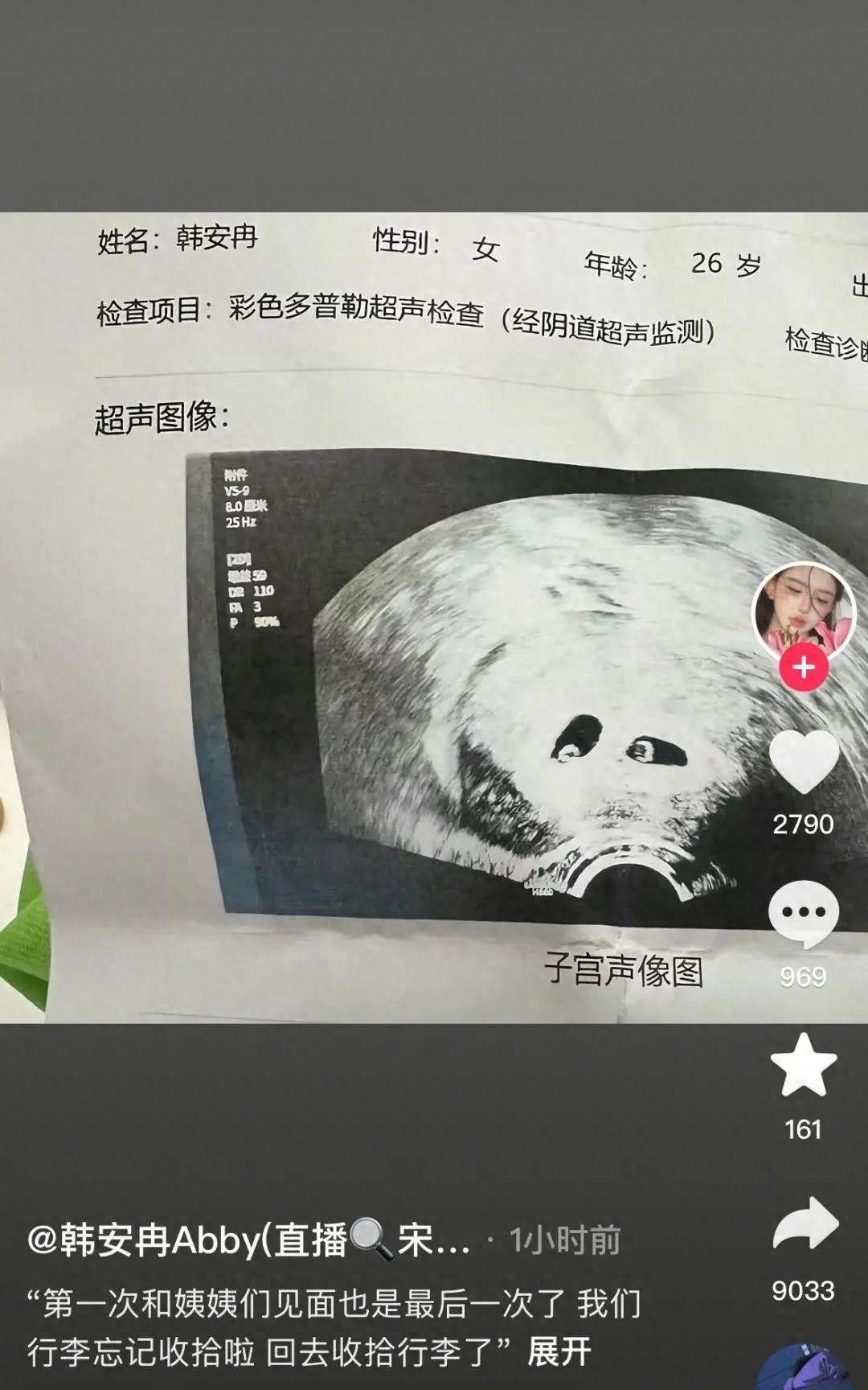 韩安冉在社交媒体平台晒出超声图,回应“流产传闻”,称不是流产而是引产。