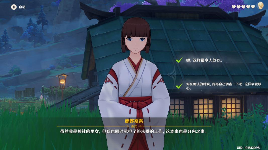 跟随任务指引与巫女对话,选择【在你确定的时候,我再自己调查一下吧,这样会更放心。】