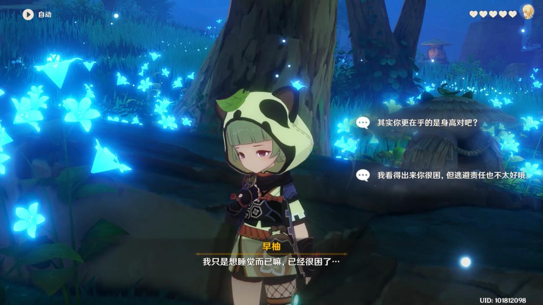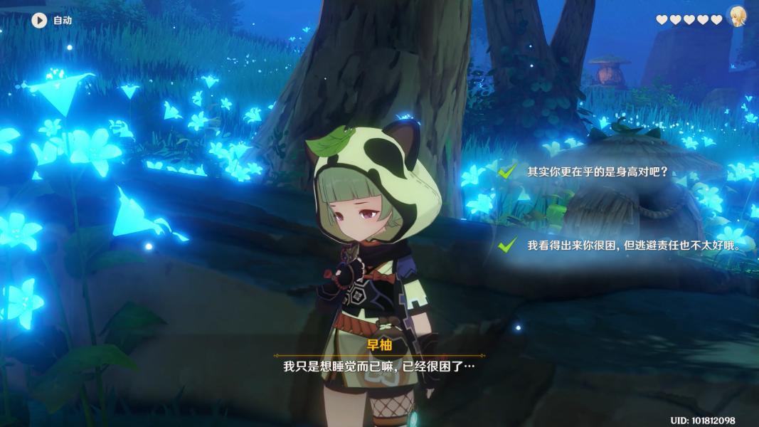 来到镇守之森,与早柚对话,选择【我看得出你很困,但逃避责任也不太好哦。】