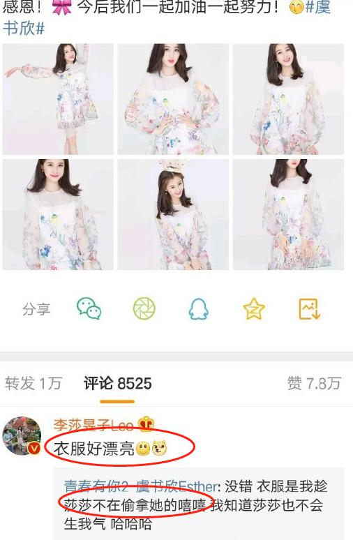 原来这件衣服的主人正是李莎旻子,虞书欣是趁她不注意时偷偷拿来穿上,并拍照片发了朋友圈。