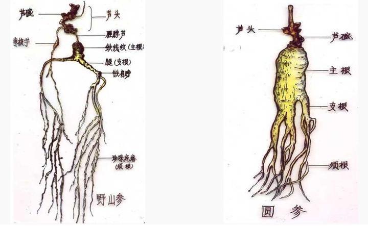 芦:野山参芦较长,一般分为二节芦、三节芦、线芦和雁脖芦(根茎细长,稍弯曲,如雁脖状)。