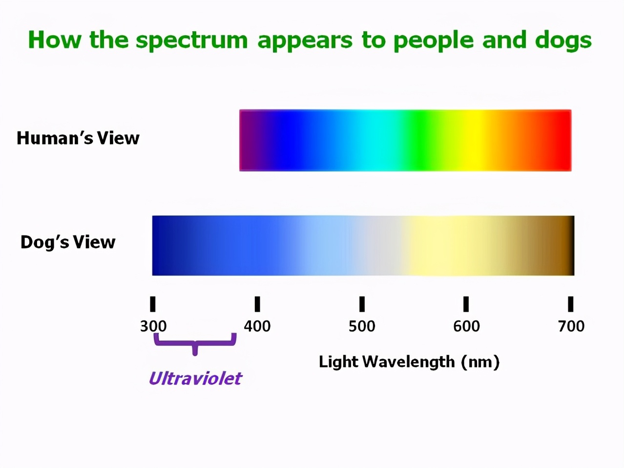 另外狗眼在紫外波长上也比人类要强得多,伦敦城市大学生物学教授罗纳德·道格拉斯(Ronald Douglas)和伦敦大学学院神经科学教授格伦·杰弗里(Glenn Jeffrey)在哺乳动物的紫外视觉研究上发现,狗能看到低于400纳米的紫外线。