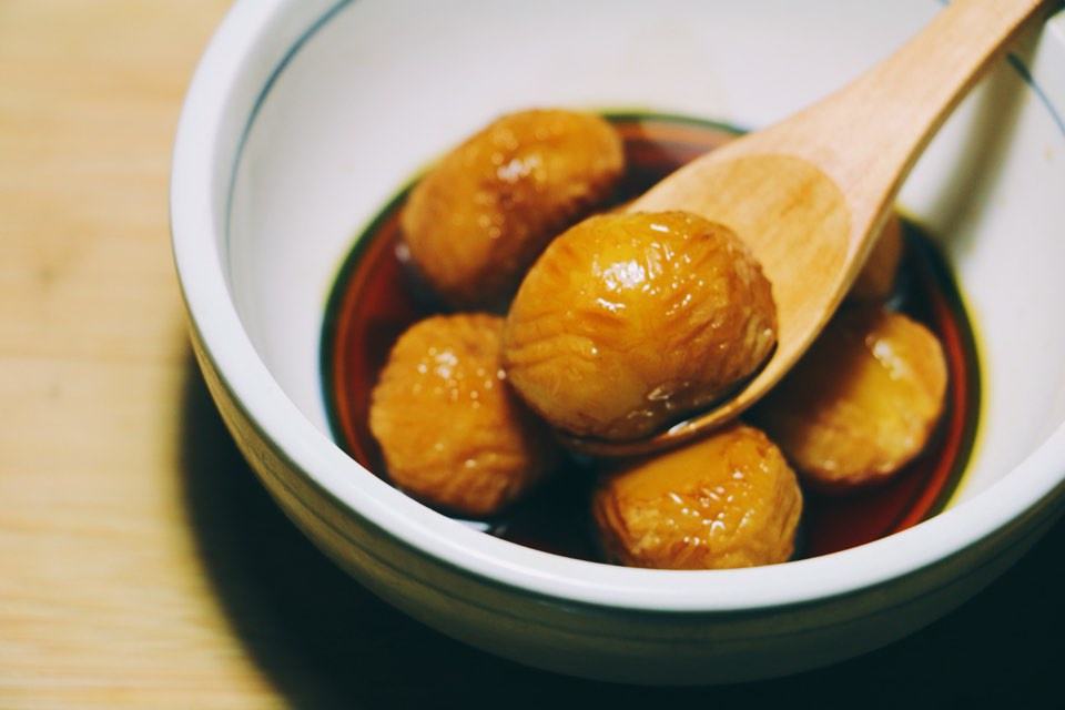 日本美食电影《小森林》里,一叠糖渍栗子让屏幕前的我忍不住咽口水。深秋的栗子剥去外壳,放入加小苏打的水里浸泡过夜,第二天多次加水煮,直到水的颜色从黑色变为酒红,用牙签剔除表皮的筋络。最后加入相当于栗子总量50%-60%的白砂糖煮沸(根据个人口味掌握),出锅前加入果酒调味,放入玻璃罐中密封。