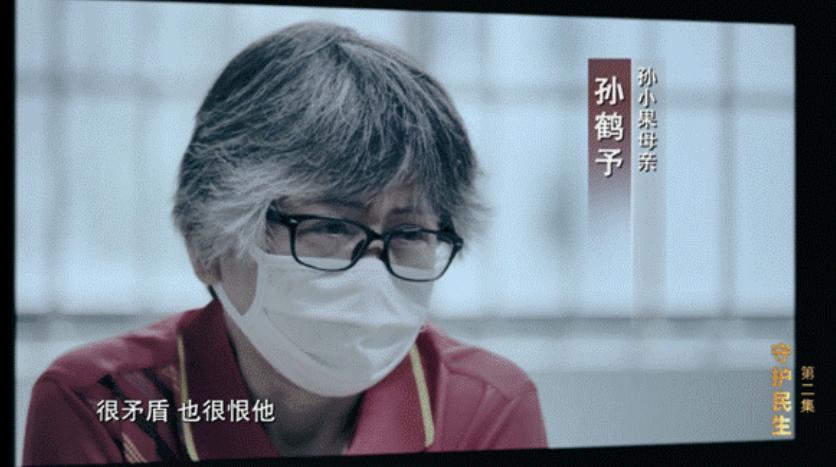 在专题片《正风反腐就在身边》第二集《守护民生》中,孙鹤予就自己数次包庇孙小果的行为,表现出无尽的悔恨,她说: