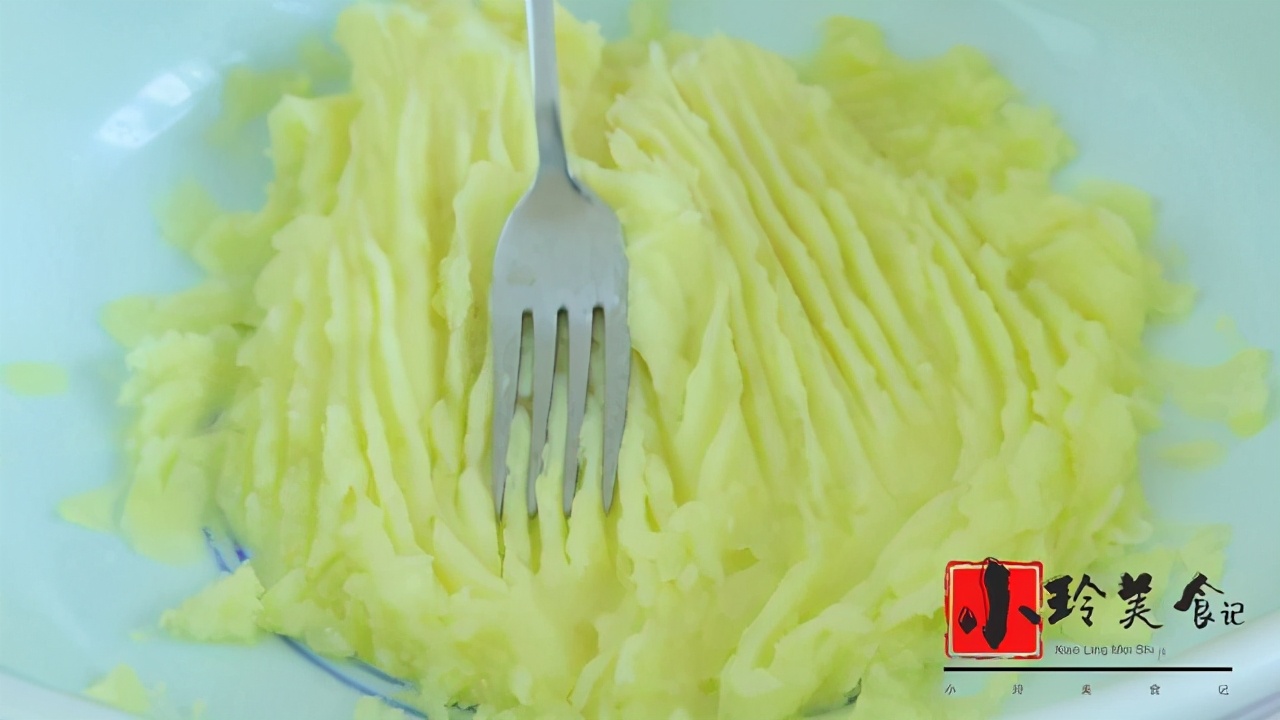 2.8分钟以后用筷子像这样一戳就烂就可以啦,从锅里面取出来倒入大碗里面按压成土豆泥,按压成像这样比较细腻的土豆泥像这样就可以啦。