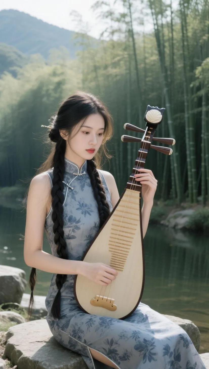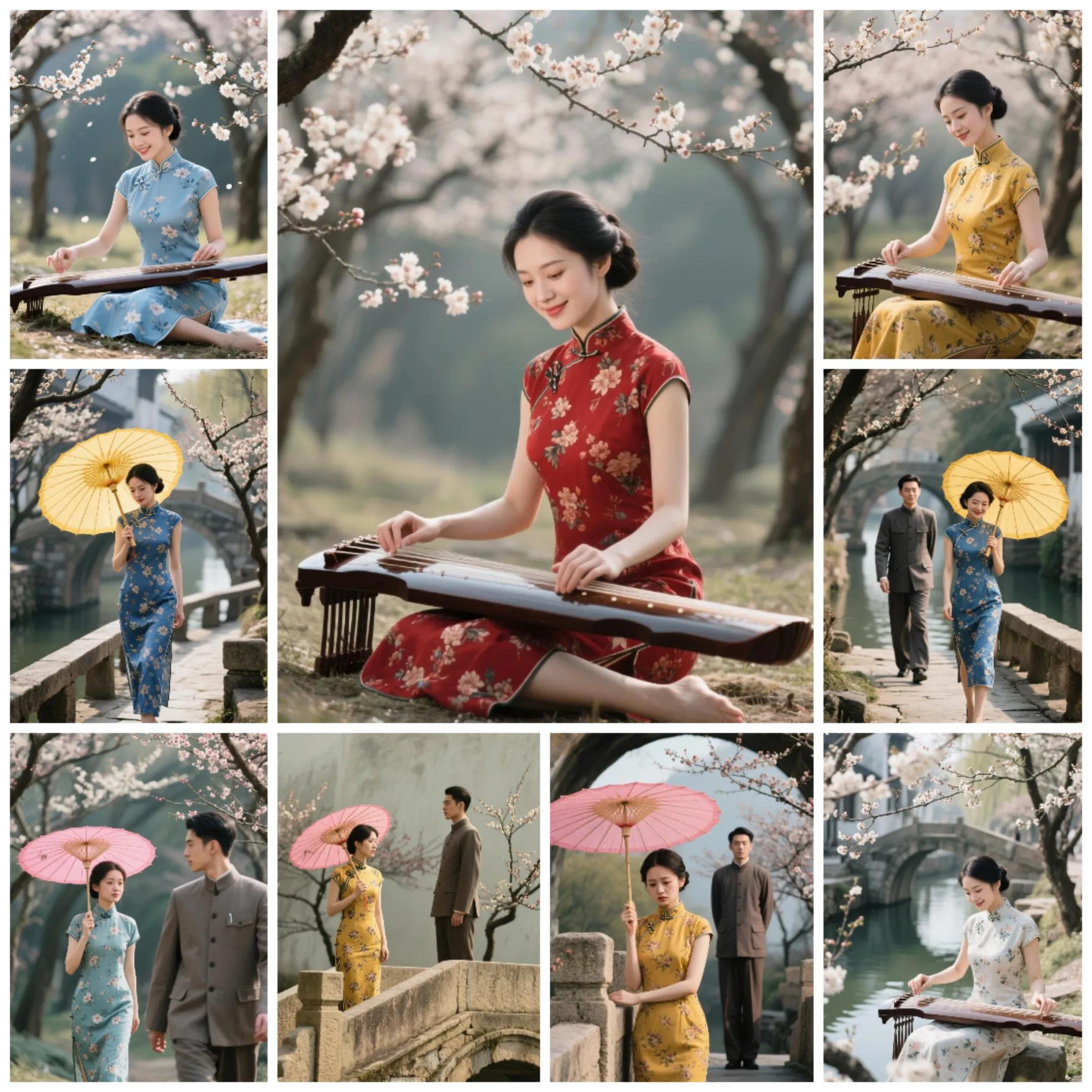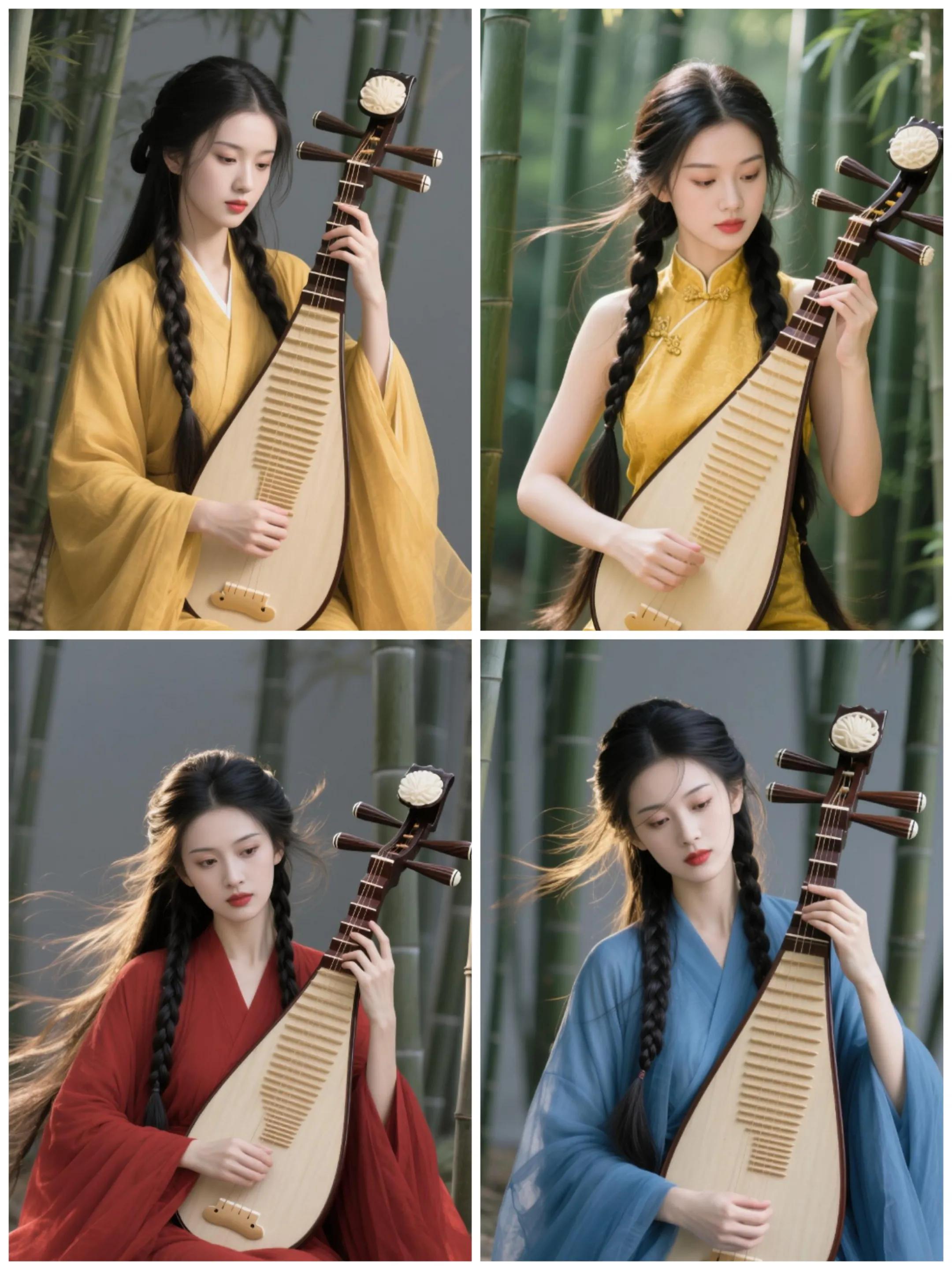 先来看一组即梦生成图片,除头一张外,后面全部是弹琵琶的动作,并且服饰的颜色不同。
