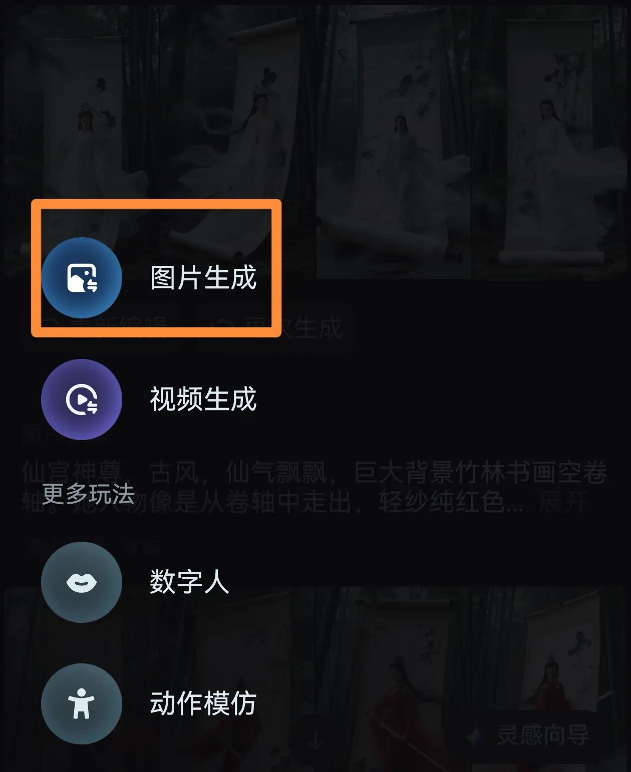 打开即梦,选择“灵感”,里面已经有许多已经生成好的图片和视频,这些图片视频生成效果一般都是不错,如我们选择左上角方框的第1张。
