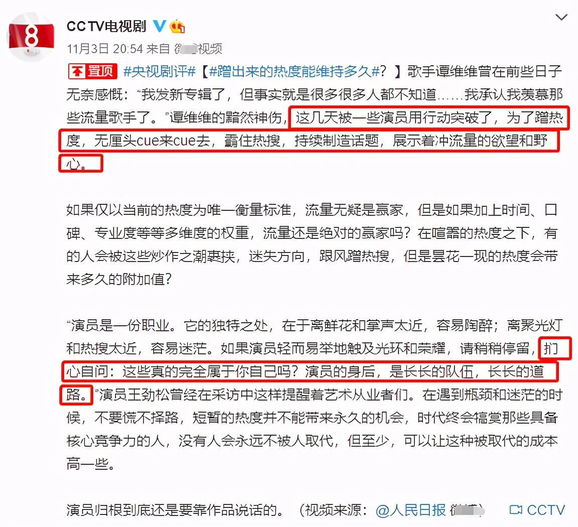 11月3日晚,这件事甚至惊动了央视,CCTV电视剧对此事做出评价称:“这几天被一些演员用行为突破了,为了蹭热度,无厘头cue来cue去,霸主热搜,持续制造话题,展示着冲流量的欲望和野心”,并告诫“演员身后,是长长的队伍,长长的道路”。