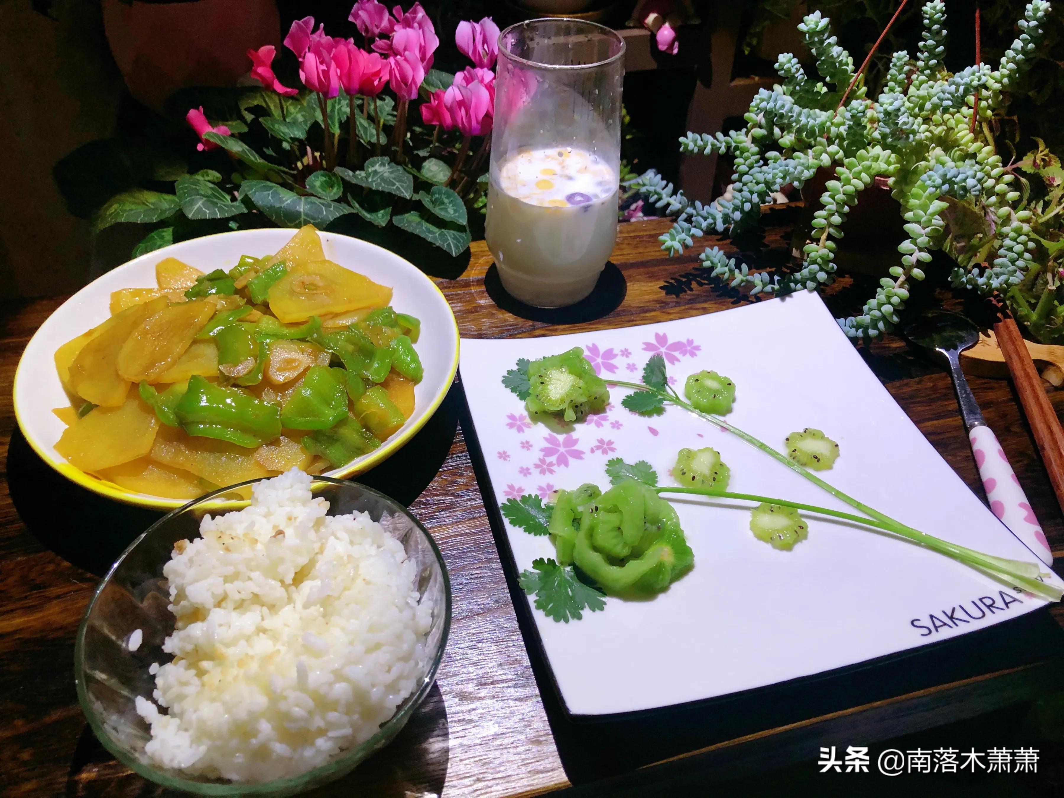 今天给自己做的饭菜是土豆片炒辣椒,然后用猕猴桃做了一束花,自然是为了让自己心情好起来。今日美食制作土豆片炒辣椒